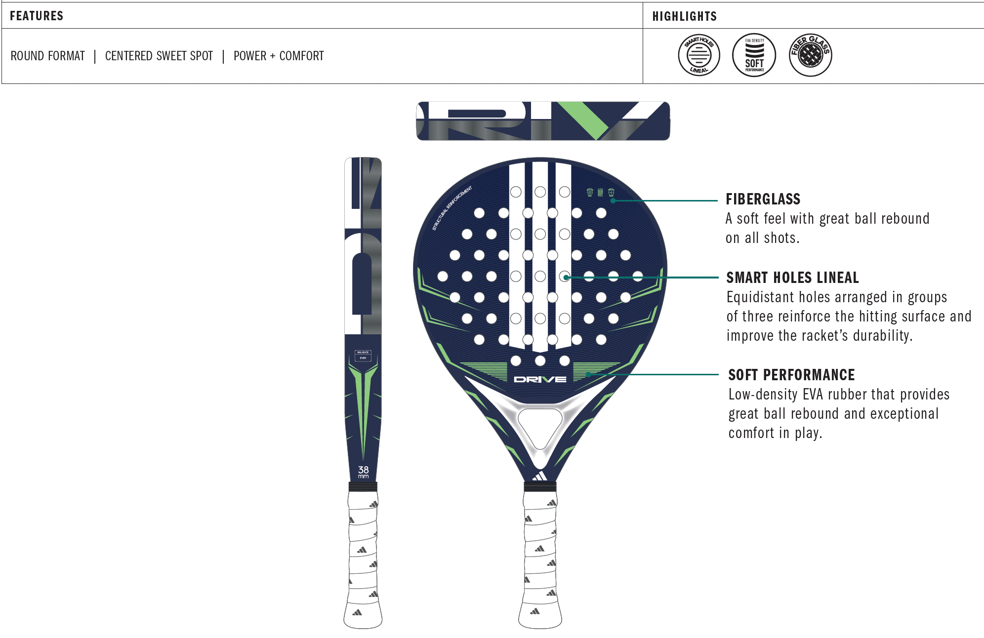 The Fiberglass surface provides a softer, more flexible feel that absorbs impact and helps players maintain control even when their technique is still developing. Paired with the Soft Performance EVA core, the Drive Blue delivers excellent ball output with a smooth, cushioned response that reduces vibration and arm fatigue during long sessions.