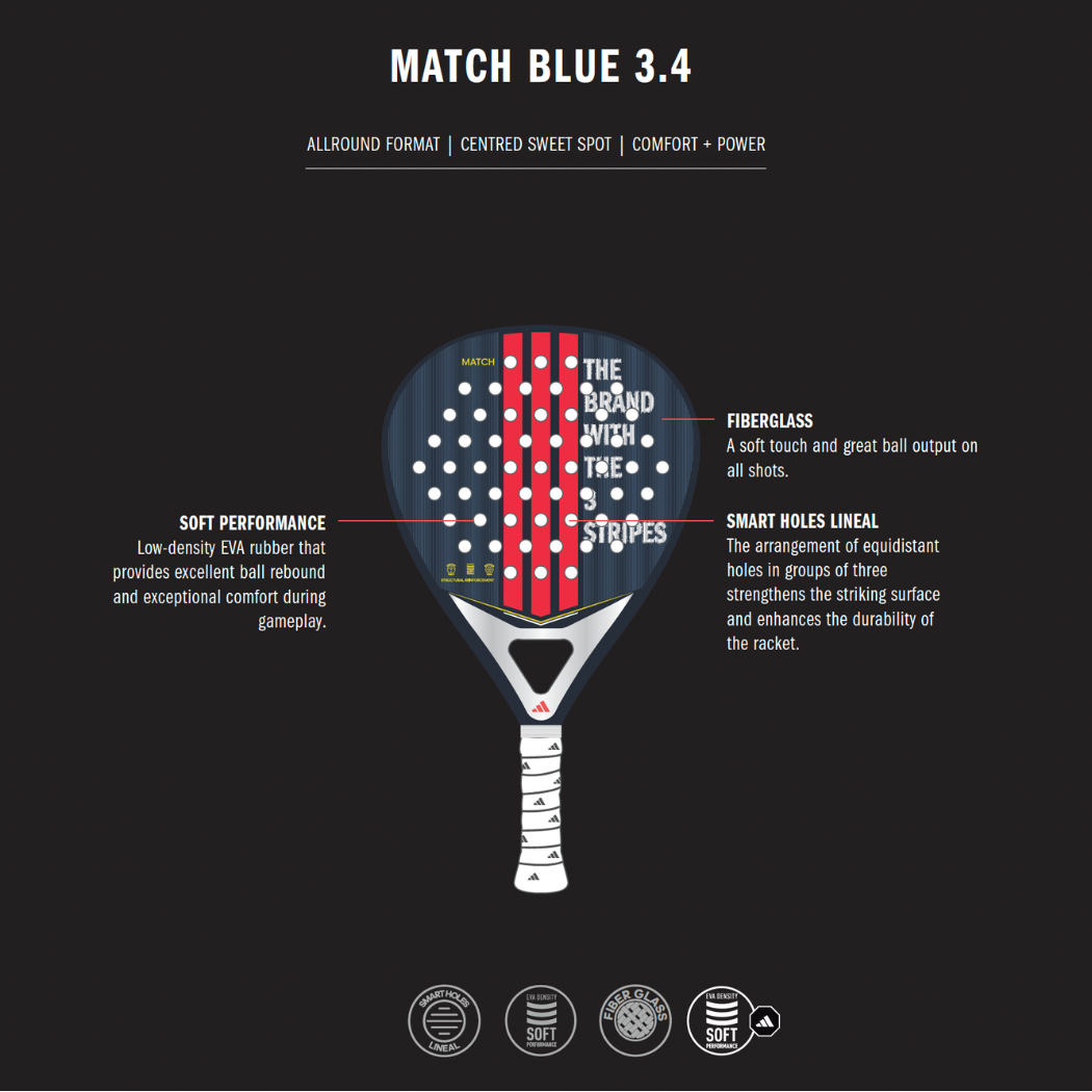 Adidas Match 3.4 – Blue is made for players who want to learn fast and play hard. With a forgiving design and all-round performance, this racket helps you build your skills while enjoying every rally.