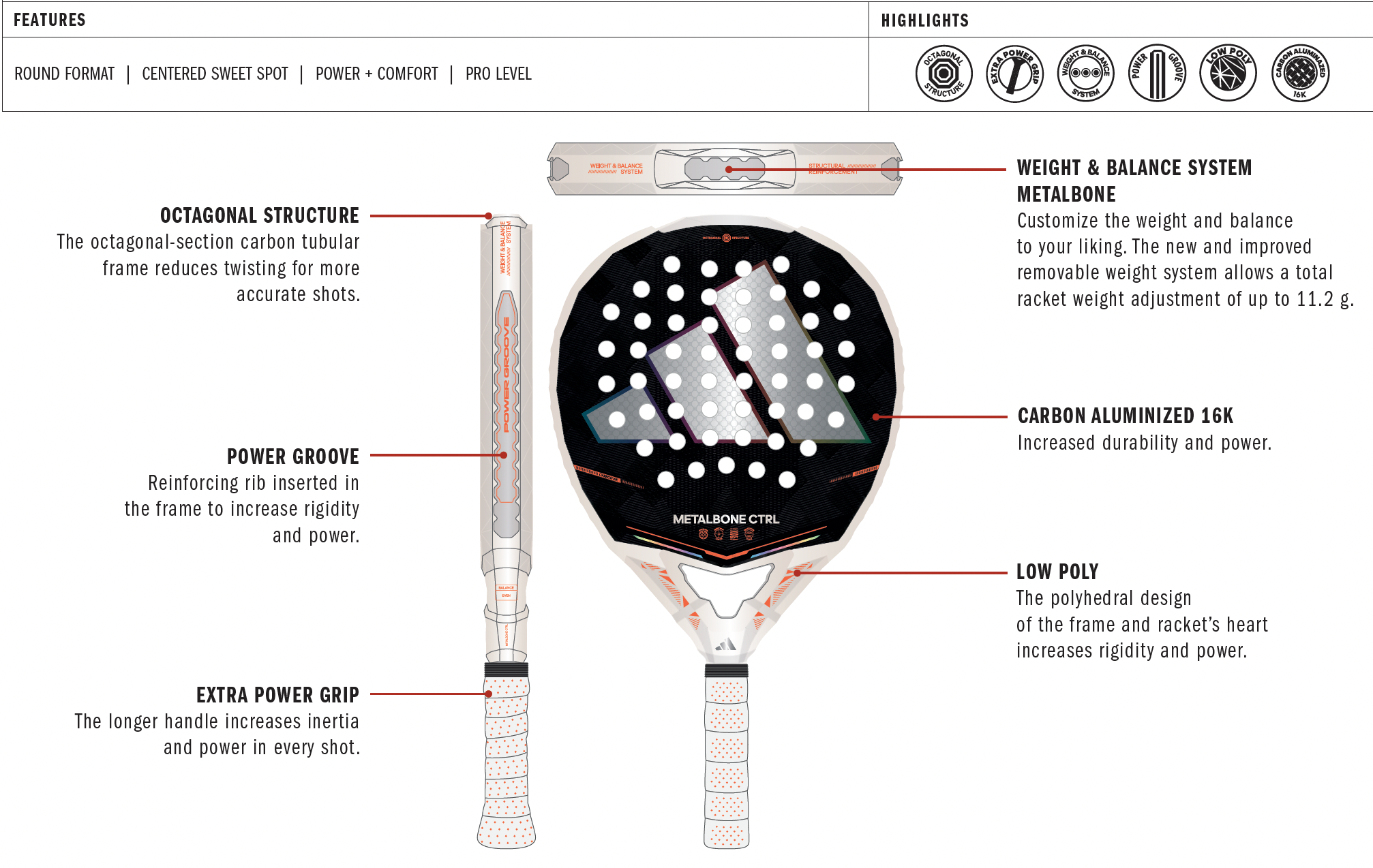 Designed for players who demand precision without sacrificing power, the Adidas Metalbone CTRL 2026 delivers exceptional control with the unmistakable explosiveness of the Metalbone line. Built around a round-shaped profile with a central sweet spot, it gives you maximum accuracy in defensive play and total confidence when accelerating into attack.