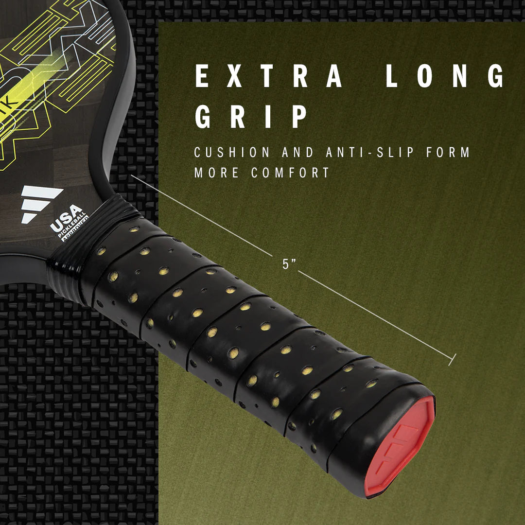 Extra Power Grip: Ideal for players using a two-handed backhand, this 5-inch-long grip shifts the mass toward the tip of the paddle, generating momentum and power in energetic shots.