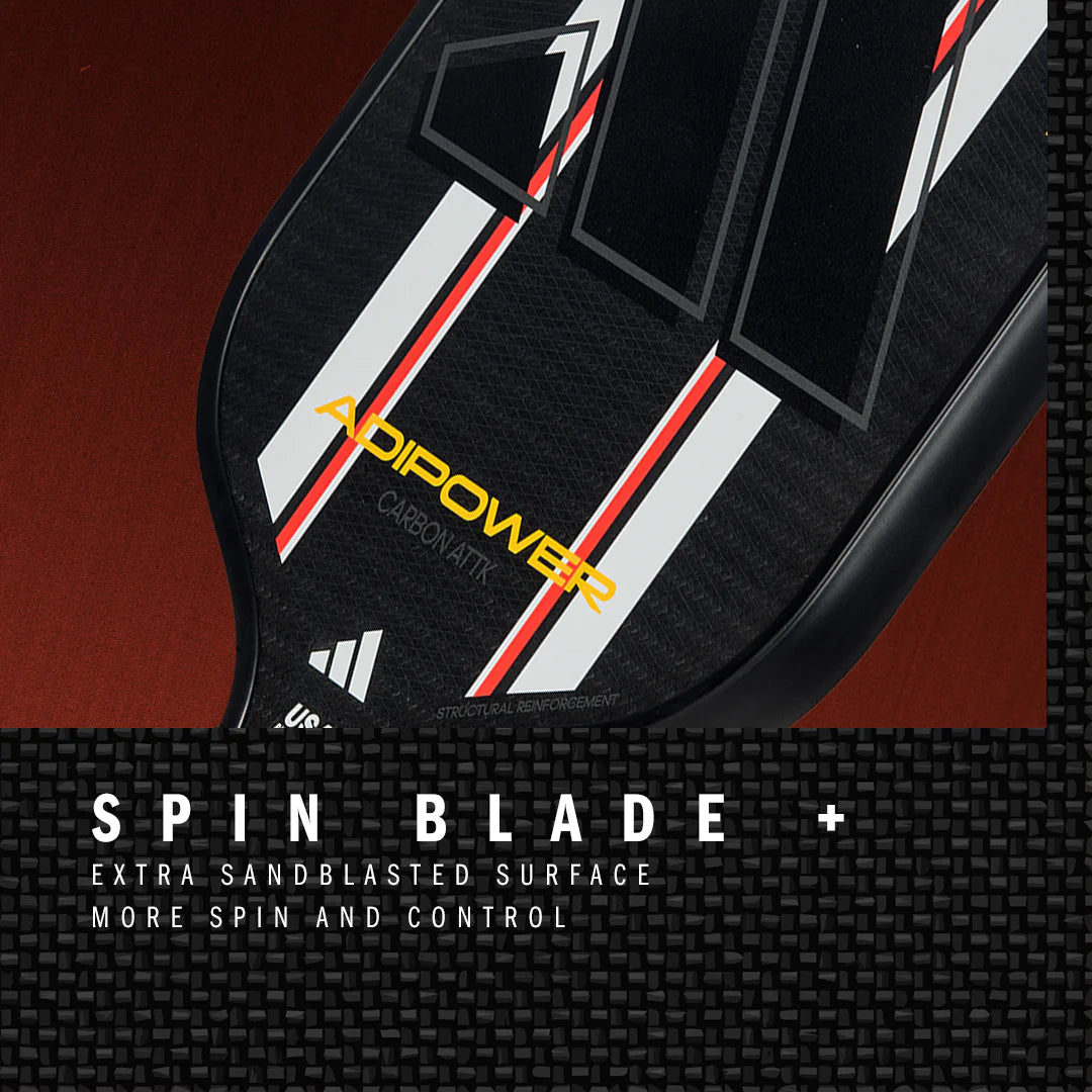 The adidas Adipower Carbon ATTK pickleball paddle combines control and power with its 16mm thickness and elongated ATTK shape, placing the sweet spot at the top for increased reach and strength.
