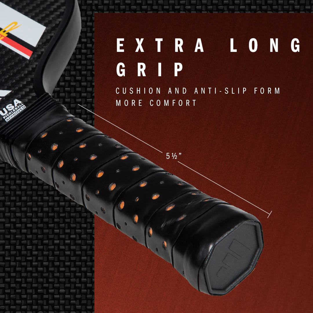 Extra Power Grip: Ideal for players using a two-handed backhand, this 5.5-inch extra-long grip shifts the mass toward the tip of the paddle, generating inertia and power in energetic shots.