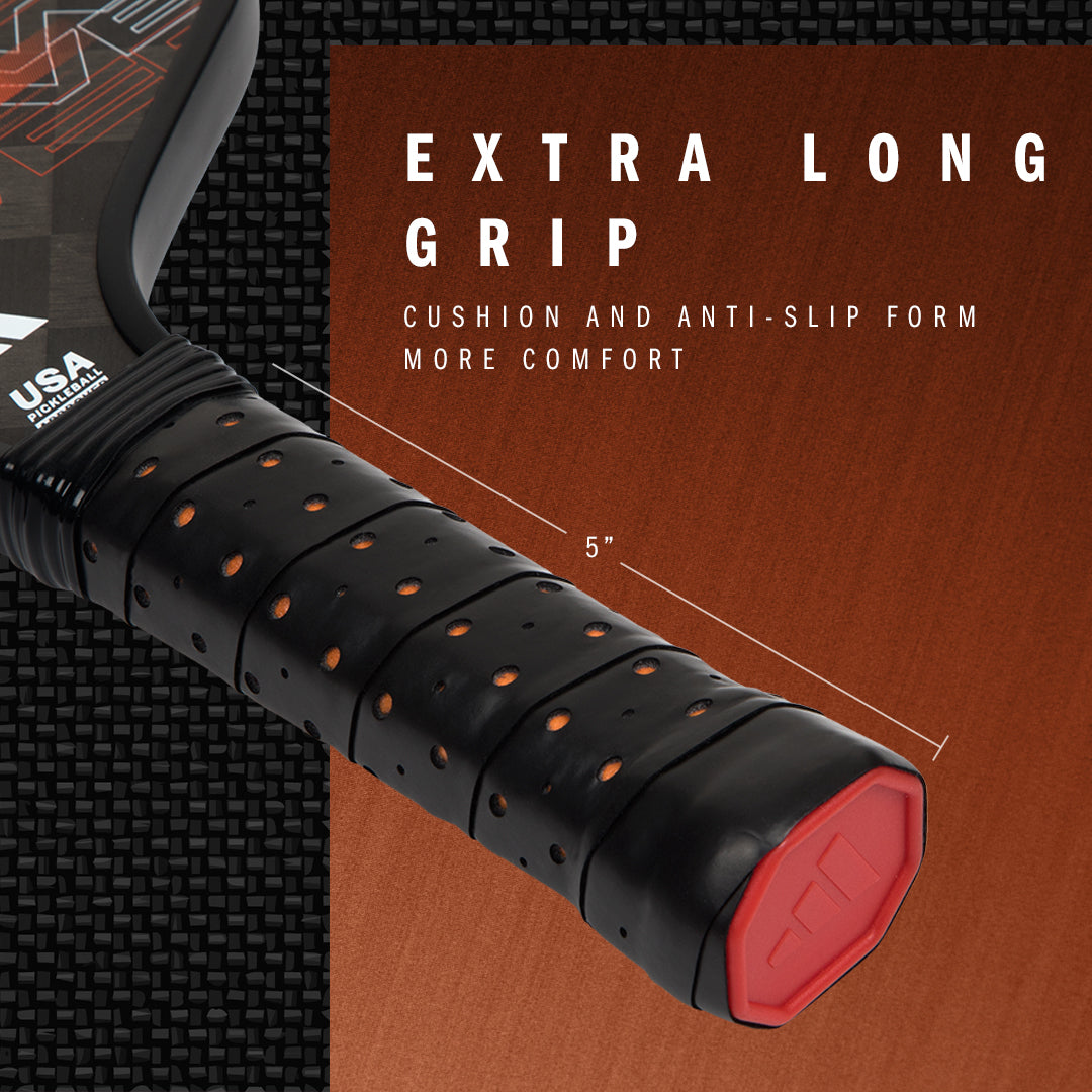 Extra Power Grip: Ideal for players using a two-handed backhand, this 5-inch-long grip shifts the mass toward the tip of the paddle, generating momentum and power in energetic shots.