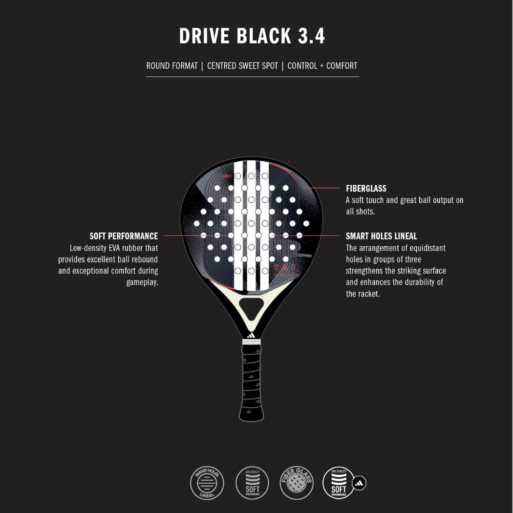 The Adidas Drive 3.4 – Black is your ultimate entry point into padel — offering effortless comfort, precise control, and an incredibly smooth feel. Designed to help you build skills and confidence, this racket makes every shot easy and enjoyable.